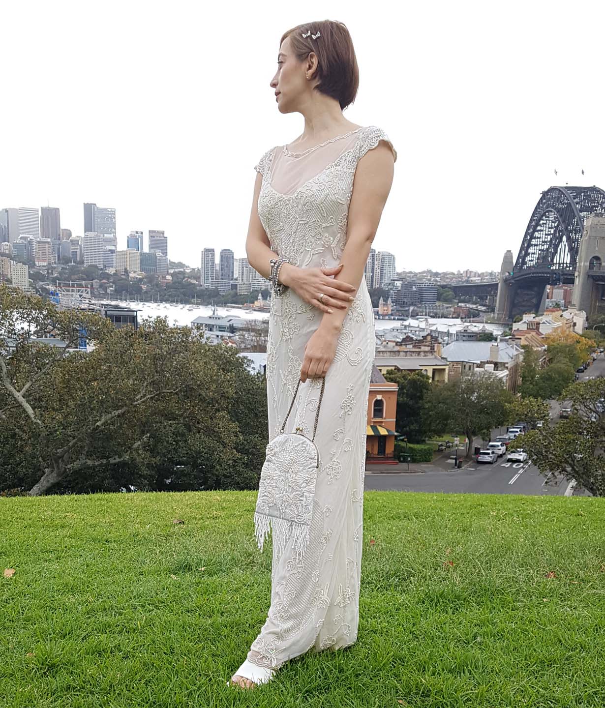 Hand embroidered with caviar and bugle beads.